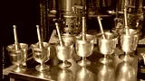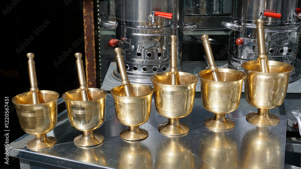 Traditional brass mortars and pestles reflecting bright light in Coppersmith Bazaar, Gaziantep City, Turkey.