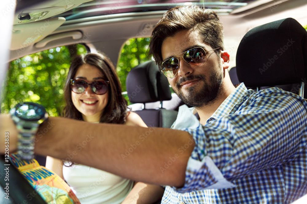 Portrait of young couple driving a car.