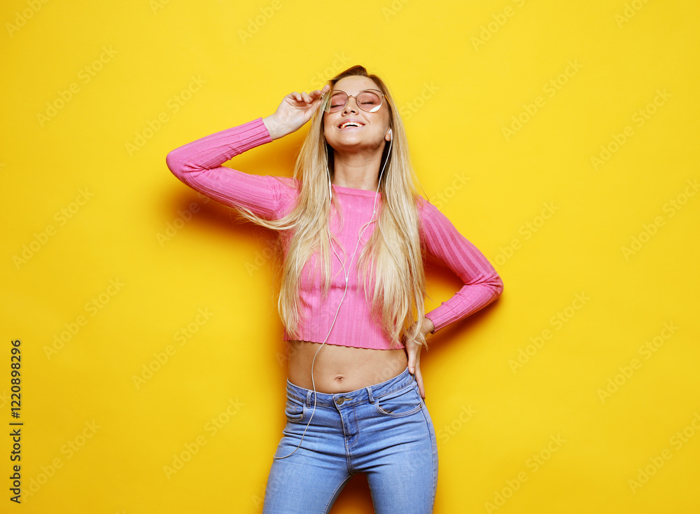 Young cute smiling blond woman over yellow background