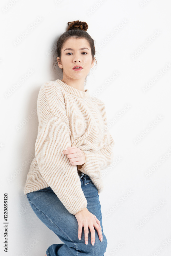 lifestyle, fashion and people concept: beautiful woman wearing casual beige sweater , posing on white background