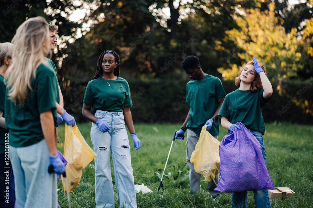 Group of volunteers picking up trash in park