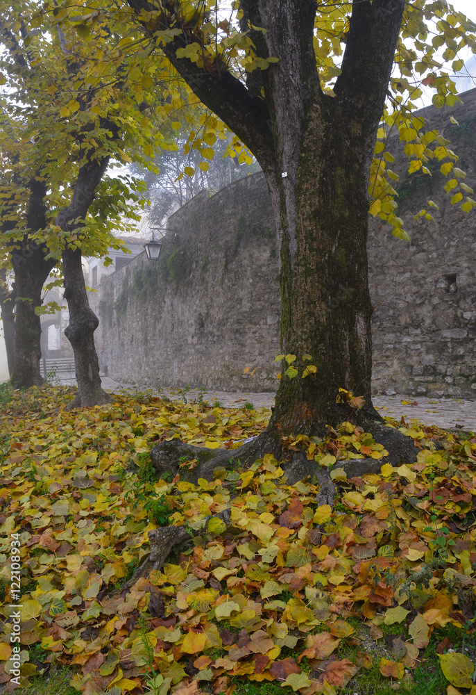 Spoleto (Italy) - A misty fall day in the charming medieval village in Umbria region. The soft focus depends on dense fog, which, however, creates an evocative atmosphere with Sun rays