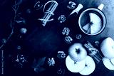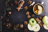Frame of autumn leaves, chestnuts and ingredients for spiced tea