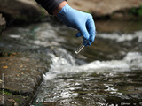 Water sample. Gloved hand into the water collecting tube. Analysis of water purity, environment, ecology - concept. Water testing for infections, harmful emissions