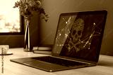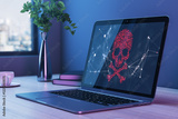 Digital skull warning sign displayed on laptop screen in office setting. 3D Rendering
