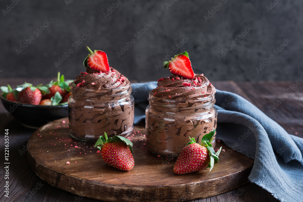 Chocolate mousse topped with fresh and freeze-dried strawberries