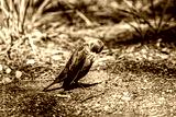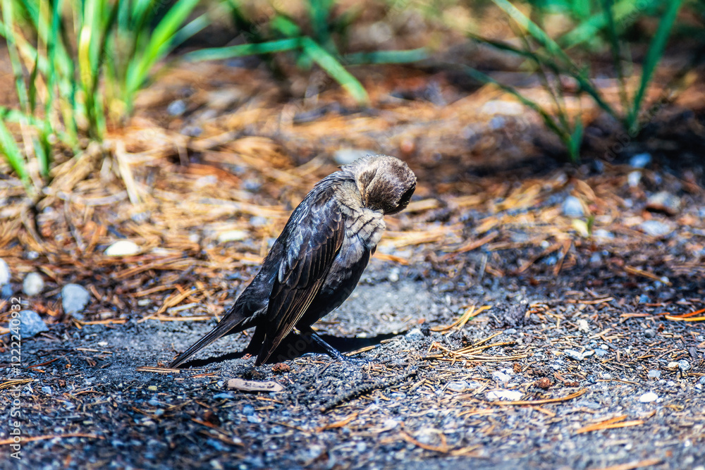 Female Brown-headed cowbird preening herself