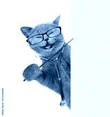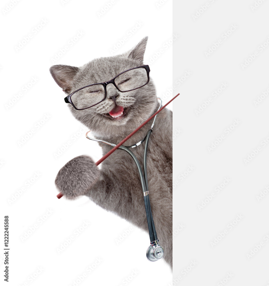 Happy cat dressed like a doctor with stethoscope on his neck looks from nehind blank white banner and pointa on empty space. isolated on white background