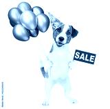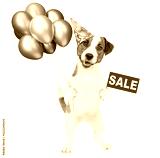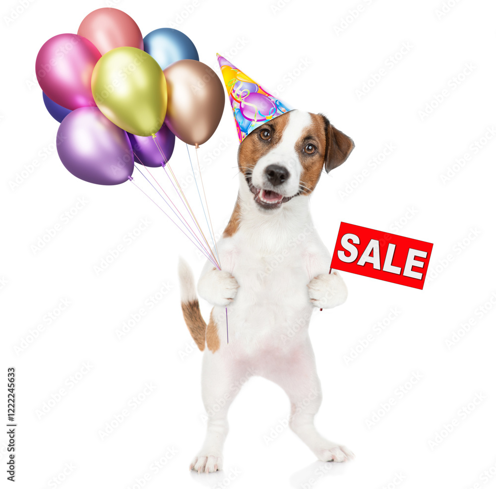 Happy jack russell terrier puppy wearing tie bow and party cap holds balloons, shows signboard with labeled "sale". isolated on white background