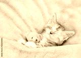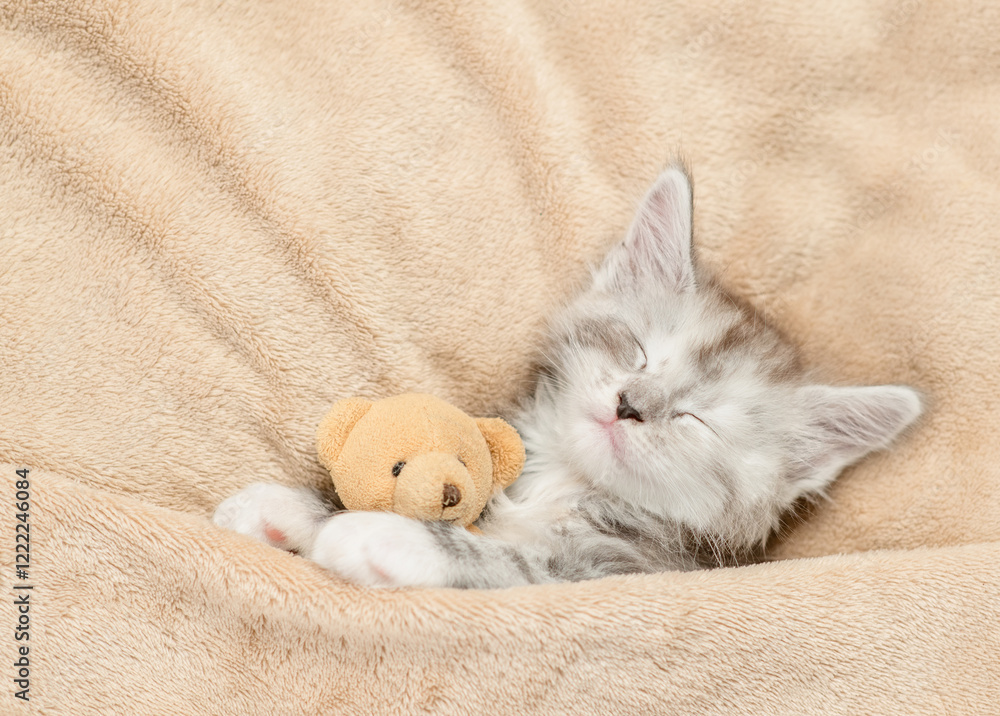 Cozy tiny Maine coon kitten sleeping with favorite toy bear under warm plaid on a bed at home. Top down view