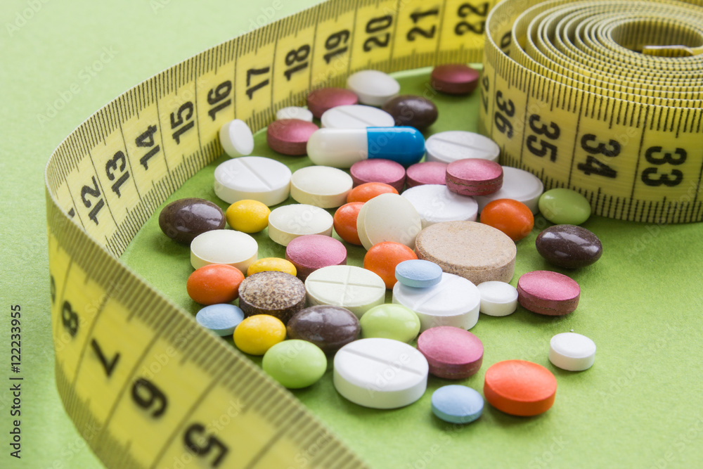 Diet pills and yellow ribbon. Yellow centimeter and pills