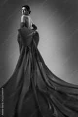 Fashion Woman in Red Silk Backless Dress with Oversized Bow side View. Elegant Lady in Open Back Satin Maxi Gown over Gray Background. Beautiful Model in Wedding Dress with Long Silk Train Fabric