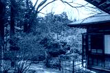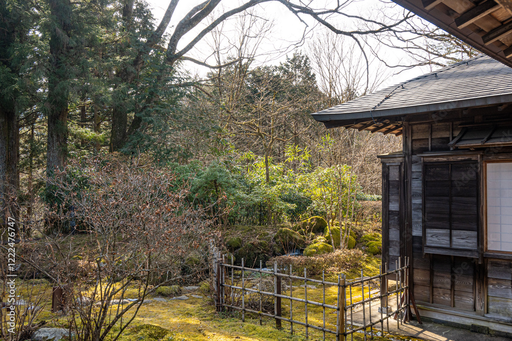 Japanese garden, greenery during winter outside in a garden at the Tamozawa Imperial Villa Memorial Park in Nikko on the countryside of Japan.