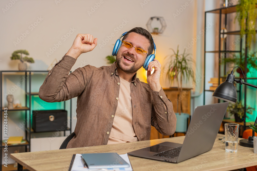 Happy relaxed young businessman with laptop at home office wearing headphones and sunglasses listening favorite energetic disco music, dancing. Freelancer man relaxing, taking a break, celebrating.