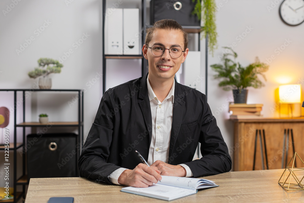 POV shot of young businessman freelancer looking to camera listening to colleague talking writing down on diary in video chat at home office. Stylish guy in suit taking notes at table. Web cam view.