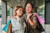 Two young women holding colorful shopping bags, smiling and confidently looking at the camera, enjoying a fun day buying and friendship together in a trendy, modern outdoor retail setting.