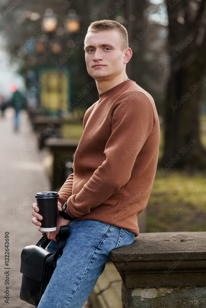Casual Young Man with Coffee in Urban Park Setting