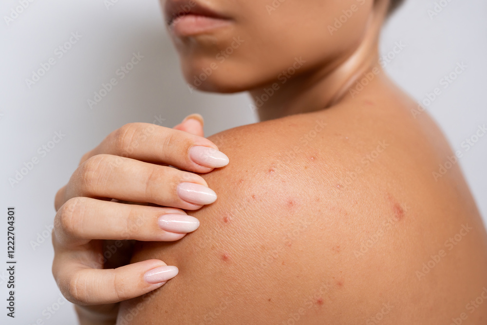 Close-up of a red rash on the shoulder. Young woman touching her back with acne problem. Allergies, pimples, hormonal changes. Problem skin, sweating sickness, prickly heat. Dermatology concept