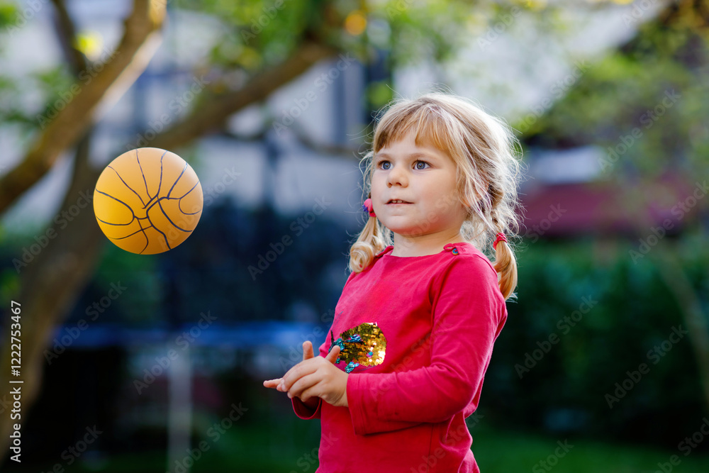 Little adorable toddler girl playing with ball outdoors. Happy smiling child catching and throwing, laughing and making sports. Active leisure with children and kids.