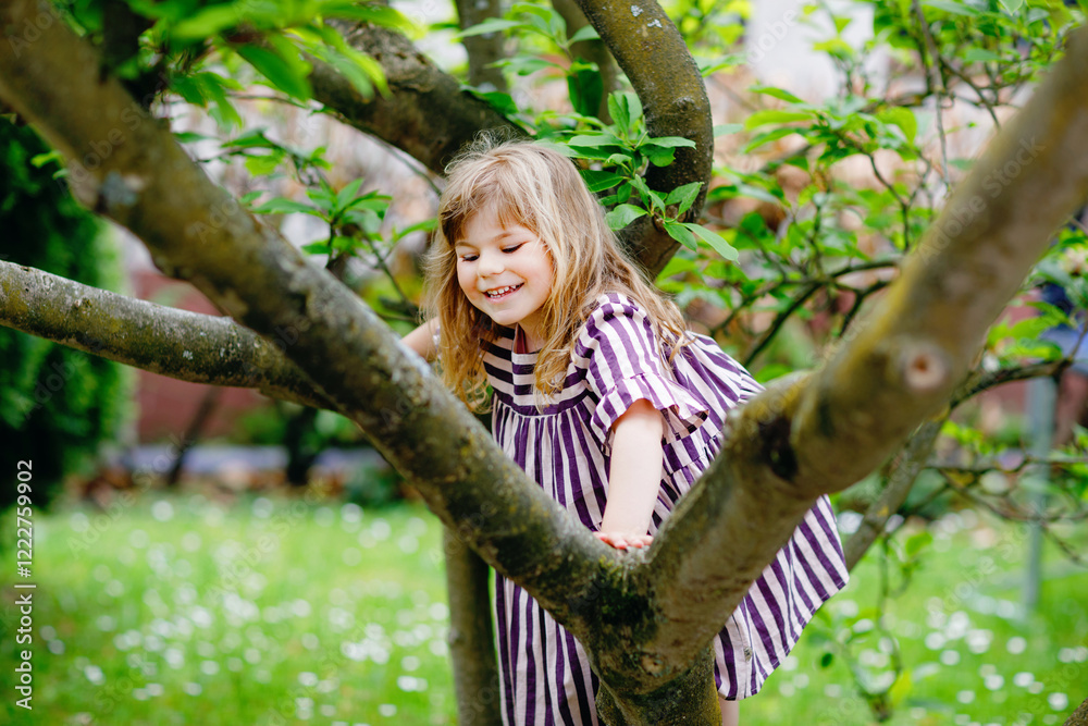 Little preschool girl climbing on tree on family backyard. Lovely happy toddler child hanging on magnolia tree, active games with children outdoors. Outdoor activity in park or garden
