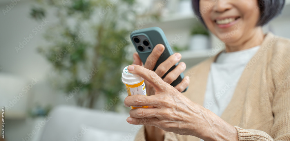 asian senior woman using smartphone searching prescription on bottle medicine,pill label about information online and video call with doctor.Health care technology and telemedicine telehealth concept