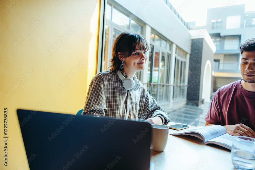 Smiling female high school student studying with a classmate in a bright study area, wearing headphones