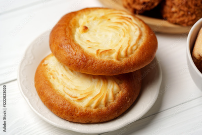Delicious baked pastries with creamy filling served on a plate at a cozy cafe in the morning