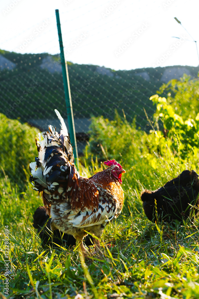 Colorful rooster foraging in a lush green field during golden hour at a peaceful farm