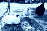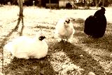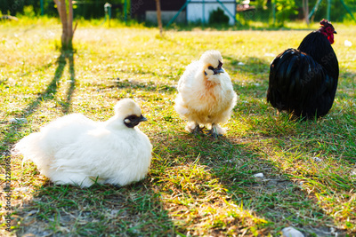 Three chickens relax on a sunny day in a green yard near a farmhouse