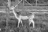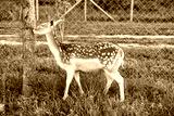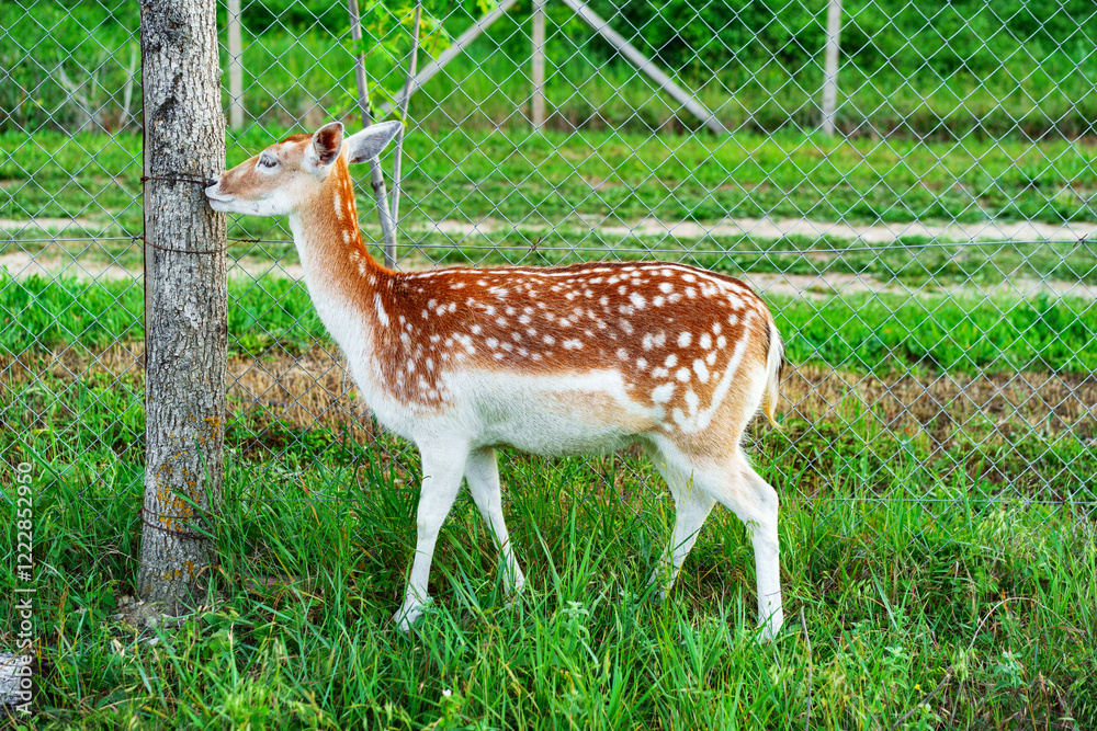 Fawn grazing near a tree in a grassy area surrounded by a fence