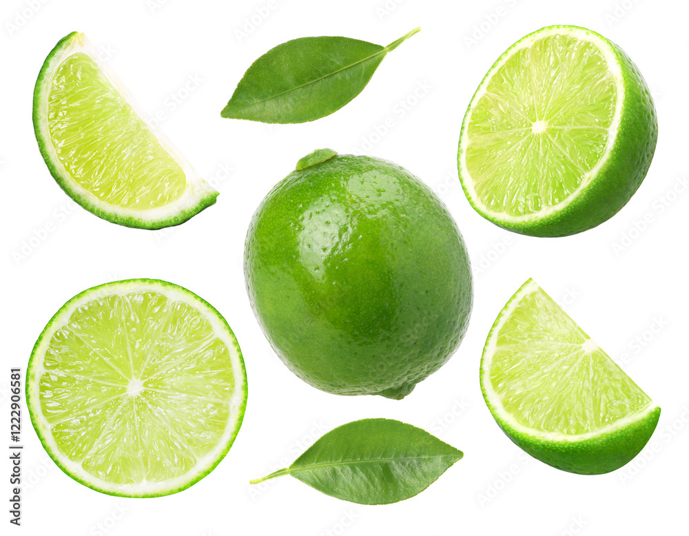 fresh lime, half, slices and leaf isolated, transparent PNG, PNG format, Juicy Lime