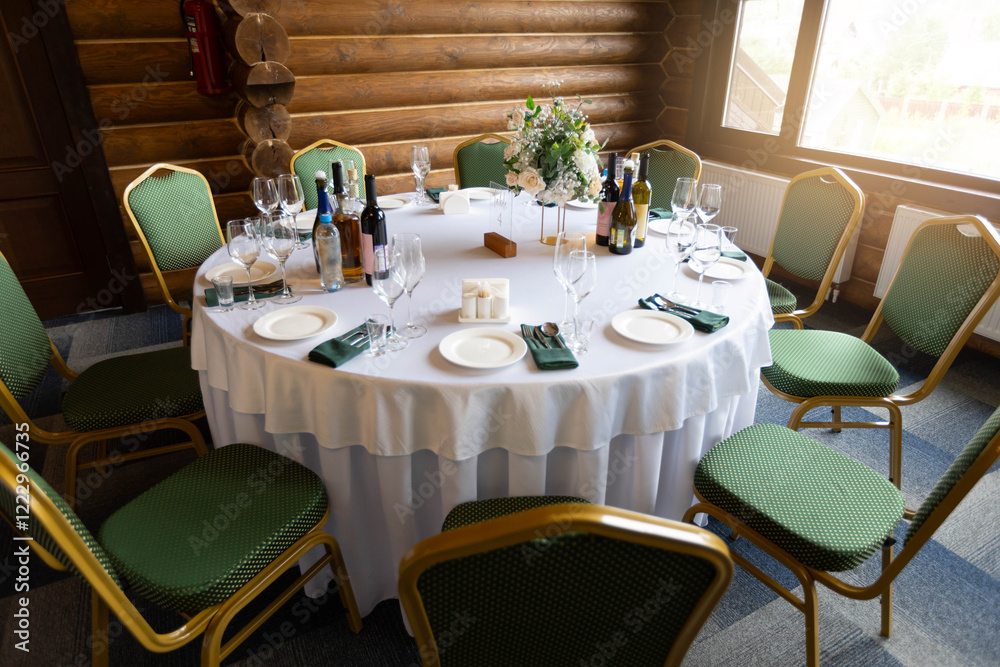 decorated round table with tablecloth in restaurant at banquet