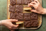 Girls hand taking a piece of Caramel shortbread, also known as caramel squares, slice, or millionaire's shortbread. Dessert, cake made with shortbread biscuit base topped with caramel and chocolate.