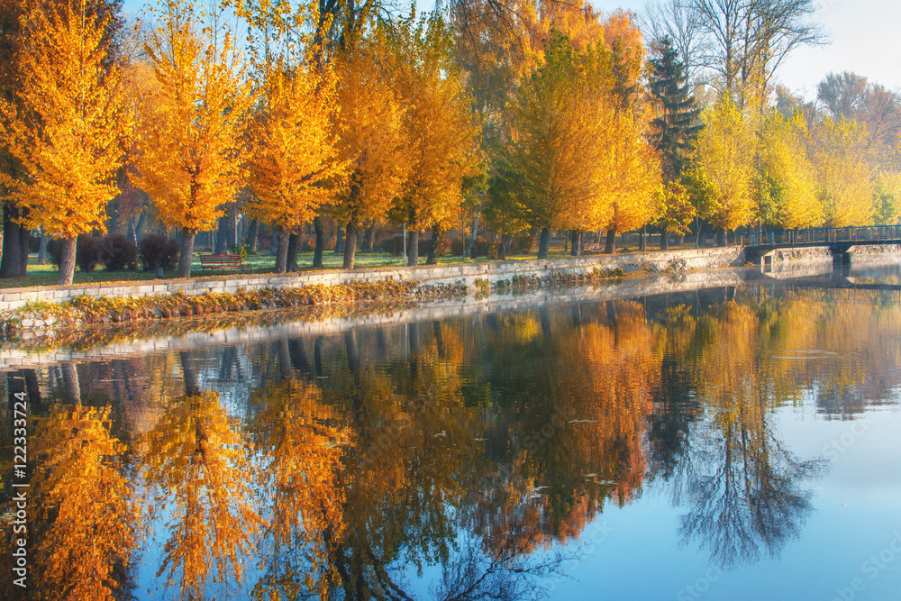 Beautiful autumn scene. Colorful foliage in the park in sunlight rays.