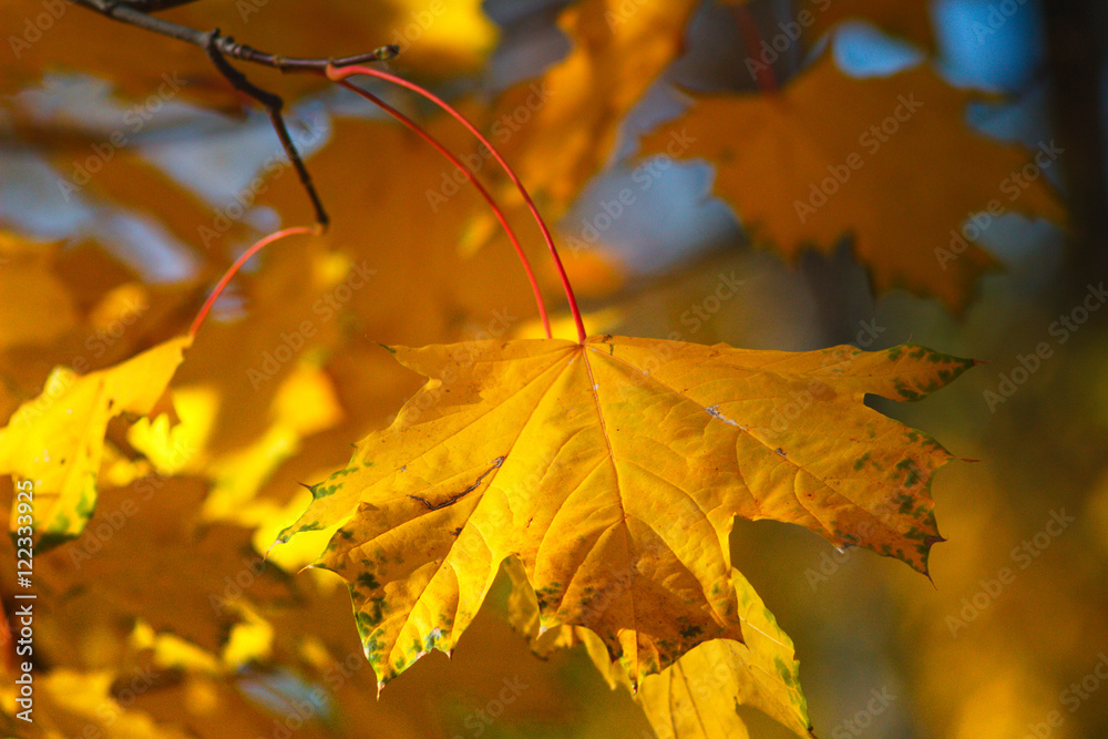 Colorful leaves of maple on a autumn trees at sunshine. Nature background.
