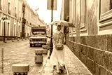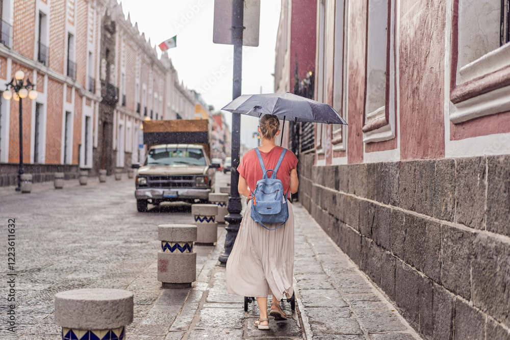 Female tourist walking through the colorful colonial streets of Puebla, Mexico. Travel, cultural exploration, and vibrant architecture concept