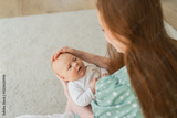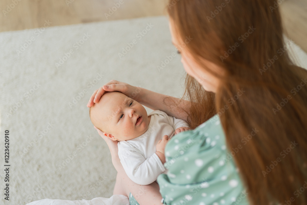 Happy family at home. Mother holding little toddler child daughter. Mom and baby girl relax playing having fun together at home. Mother hugs baby with love care. Mom of breast feeding baby