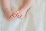 Tiny newborn infant baby feet and toes on white background. Soft newborn baby foot legs under the white blanket. Close up of infant barefeet. Maternity tenderness parenthood birthday. Happy Family