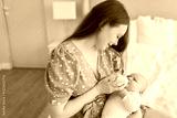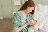 Happy family at home. Mother holding little baby toddler child feeding milk from bottle. Newborn Infant baby girl sucking eating drinking milk. Mom of breast feeding baby. Motherhood happy child