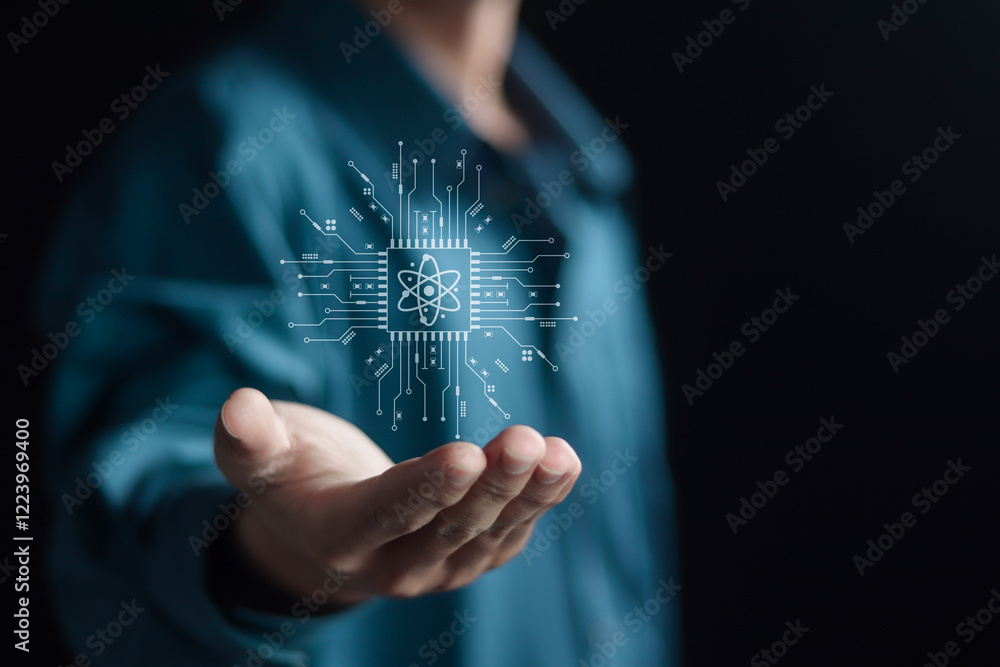 Quantum computing concept. Processing massive amounts of data in a short time. Businessman showing Quantum computing icon on virtual screen