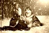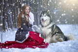 The woman in grey coat with a dog or wolf. Fairy tale. Snowfall. Christmas.