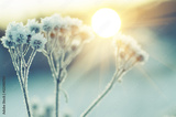 Frozen meadow plant, natural vintage winter background, macro image with sun shining