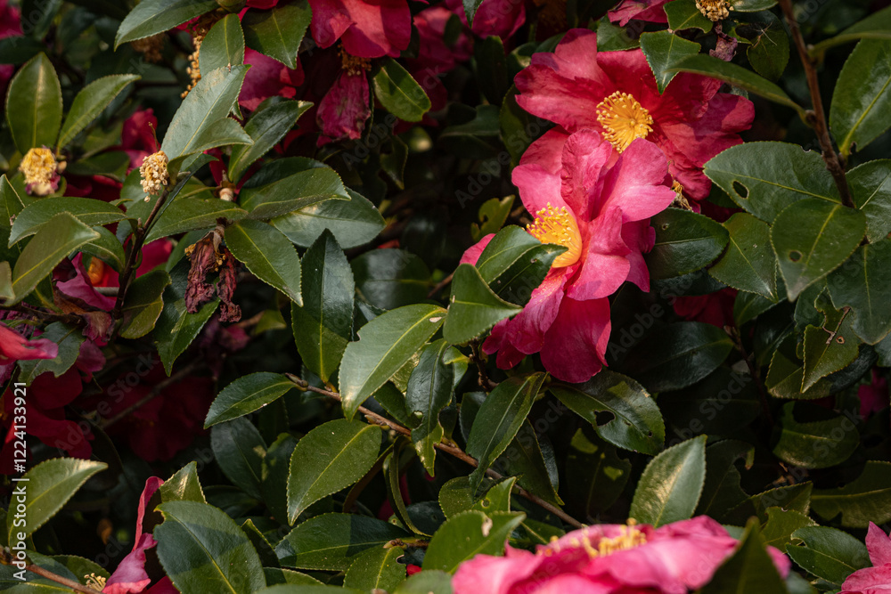 Flower background, blooming Camellia blossoms at daytime in winter outdoor in a park in Tokyo city in Japan.