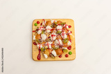 Hong Kong waffle dessert with fruits, whipped cream, chocolate and candies on square wood board