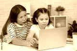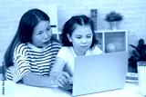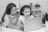 online tutor online course for Asian children. video conference on laptop at home. play back online course, girl student wear earphones to study, notes homework, video classes, new education..