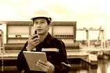 maintenance and inspector. Maintenance engineers are using tablet to checking results of inspection of buildings and structures. Irrigation engineers are exploring sluice systems