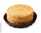 Delicious layered cake topped with crispy coconut flakes displayed on a round black platter