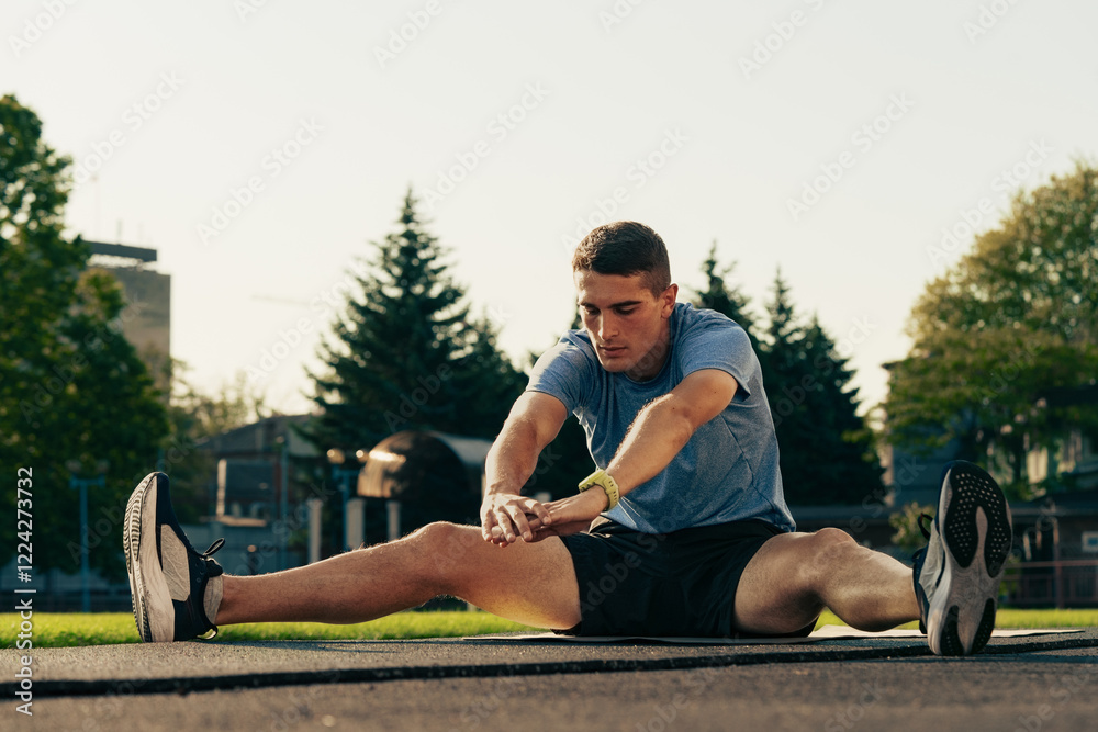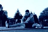 Man performs stretching exercises outdoors in a park during early morning hours for fitness and flexibility