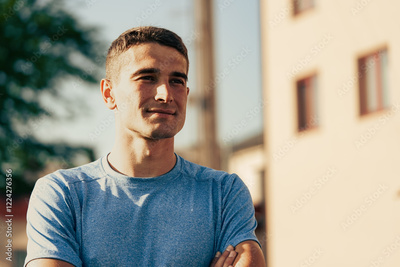 Young man smiling while standing against a building in a bright outdoor setting during daytime