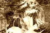 Waterfalls, the Ryūzu Falls located upstream from the Yugawa River which makes its way into Lake Yunoko and Lake Chūzenji located near Nikko at daytime in winter with snow in Japan.